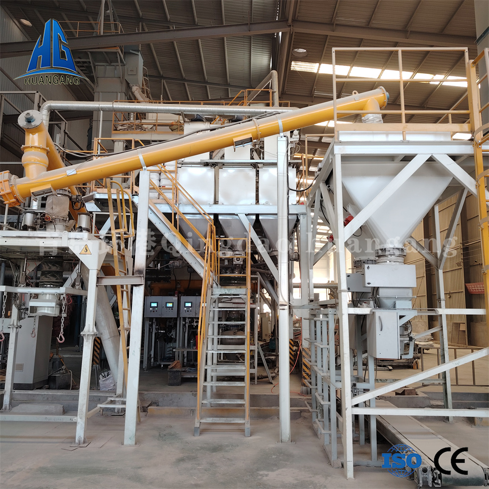 主控制系統依據選定工藝配方下達生產指令,系統自動從儲料倉中按配比提取原料,原料經配重后依次進入待混倉及單軸混合機,實現快速混合作業(3-5分鐘)。達到混合精度要求后,成品砂漿被輸送至成品倉,進入自動灌裝流程,新設計的自動包裝機按要求進行定時定量灌裝作業,大大提高產出效率,包裝好的成品被送至成品區堆放,等待出廠。