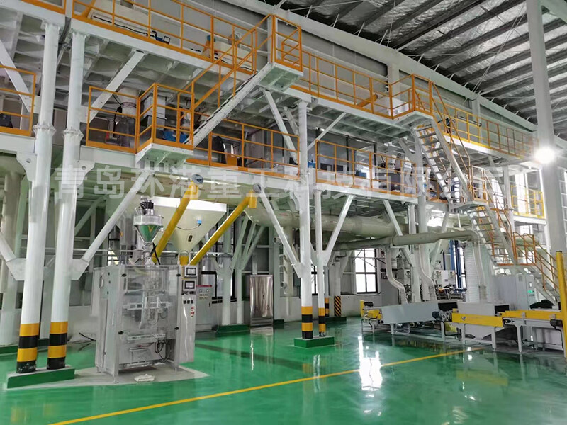 該生產線由儲料系統、輸送系統、稱重配料系統、混合系統、成品儲存系統、包裝系統、除塵系統和電控操作系統等組合而成。在秉承傳統干粉混合生產線運行穩定、計量精確、操控簡易的基礎上,采用頂部配料的方式,減少物料輸送行程,降低批次生產所需時間,提高產量。物料在整個生產流程中都在密封環境下進行,降低灰塵。再配備我公司生產的脈沖除塵器,大大改良生產環境,保證工作人員的身體健康。
